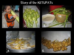 1. the lil sister that wanted to carry the 'daun ketupats' soo much..haha..kene bully! 2. me..my dad n my elder bro had to 'menganyam' ketupat...bt the ketupats in tis pix is ALL made by yurs truly hor!! 3. den mummy wld fill in the rice... 4. in the pot the ketupats go...why the white liquid? coz my family eats ketupat LEMAK...power giler beb!! sedapppp!! 5. all done..n had to be 'aired' to make the rice in it harden...